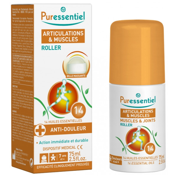 Soulagez de façon naturelle vos articulations et muscles douloureux grâce au Roller aux 14 huiles essentielles du laboratoire Puressentiel.
