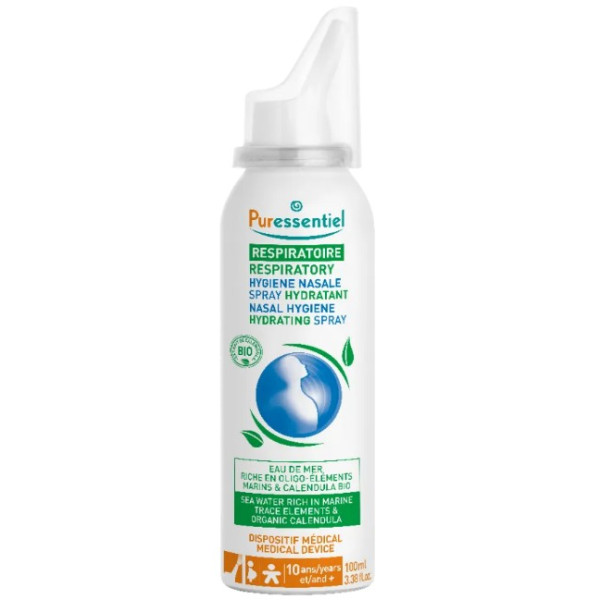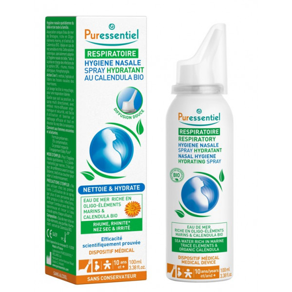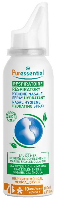 - Indiqué pour une hydratation quotidienne des voies nasales, le spray hydratant hygiène nasale respiratoire de Puressentiel est présenté dans un flacon de 100 ml. Son embout ergonomique micro-diffusion assure une diffusion douce dans les narines.