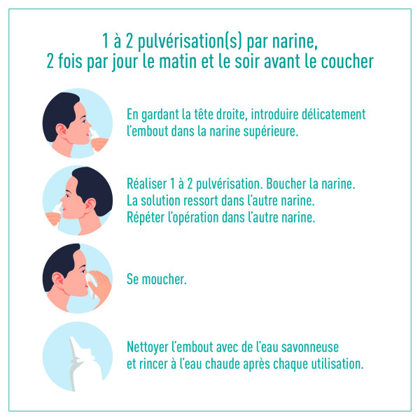 - Amorcer d’abord le spray hydratant en appuyant brièvement sur l’embout du flacon. Ensuite, effectuer une ou deux pulvérisations par narine en gardant la tête bien droite. Pour retirer l’excédent, il suffit de se moucher.
