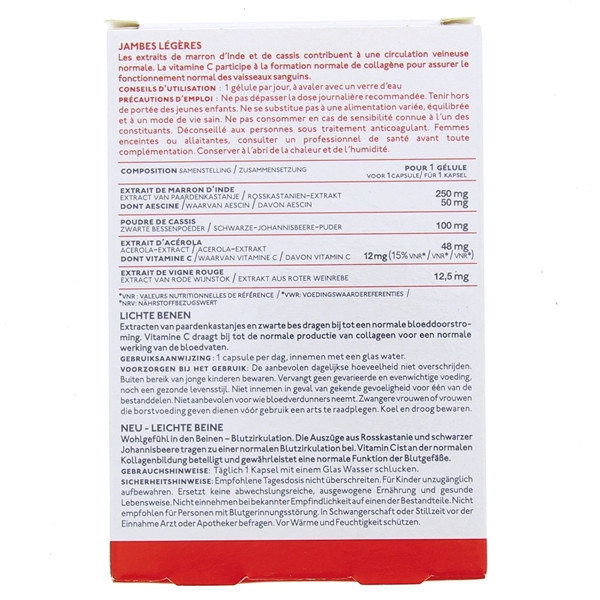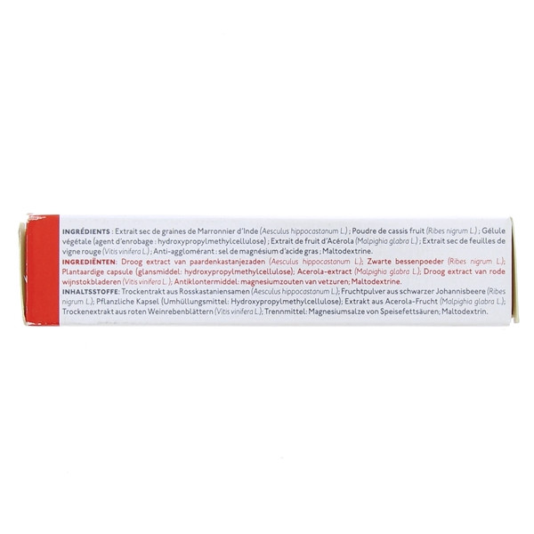 Extrait sec de graines de Marronnier d’Inde (Aesculus hippocastanum L.) titré en æscine?; Poudre de cassis fruit (Ribes nigrum L.)?; Gélule végétale (agent d’enrobage : hydroxypropylmethylcellulose)?; Extrait de fruit d’Acérola (Malpighia glabra L.) titré en vitamine C?; Extrait sec de feuilles de vigne rouge (Vitis vinifera L.)?; Anti-agglomérant : sel de magnésium d’acide gras?; Maltodextrine.