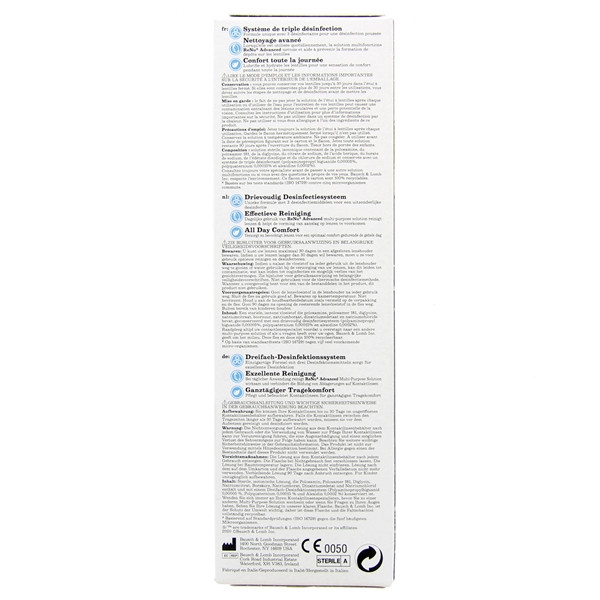 Renu Advanced de Bausch + Lomb est une solution multifonctions avec un système triple désinfection pour nettoyer efficacement les lentilles et éliminer tous les germes.