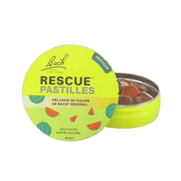 Les Pastilles Pastèque Rescue offrent l’opportunité de profiter des bienfaits de ces friandises relaxantes à tout moment, en toute discrétion. Elles sont formulées à base de 5 fleurs de Bach dont la combinaison des vertus favorise la détente après un choc sentimental ou en cas de tension nerveuse. L’hélianthème donne le courage de surmonter la peur face à l'adversité. L’étoile de Bethléem apaise la tristesse après une épreuve émotionnelle ou physique. Le prunier cerise aide à se maîtriser pour retrouver rapidement le calme intérieur. L’impatience apporte un secours précieux lorsque les nerfs sont à fleur de peau et permet de regagner la quiétude. La clématite soutient pour avoir une vision positive. Conditionnement : boîte 50g.