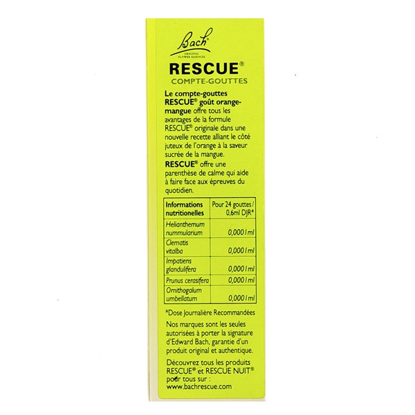 Les gouttes Rescue Orange-Mangue apaisent efficacement le stress. Ce produit associe cinq Fleurs de Bach Originales cueillies à la main. Ces dernières comprennent le Rock Rose, l’Impatiens, le Clematis, la Star of Bethlehem et le Cherry Plum.