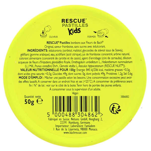 Respectez la dose journalière recommandée, car une consommation excessive peut avoir des effets laxatifs. L’administration du Rescue Kids Nuit Pastilles Jolis Rêves Framboise doit se faire sous la supervision d’un adulte. Il est indiqué de conserver ce supplément dans un endroit frais et sec à une température <25 ° C.