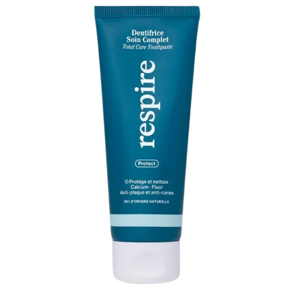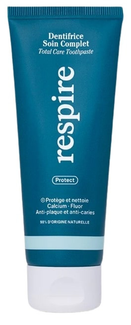 Le Dentifrice Naturel Soin Complet de la marque Respire est formulé à base de 99 % d'ingrédients d'origine naturelle. Il nettoie efficacement les dents pour éliminer la plaque dentaire.