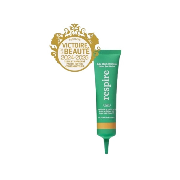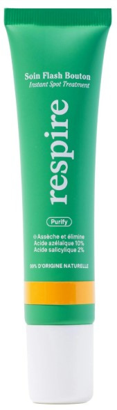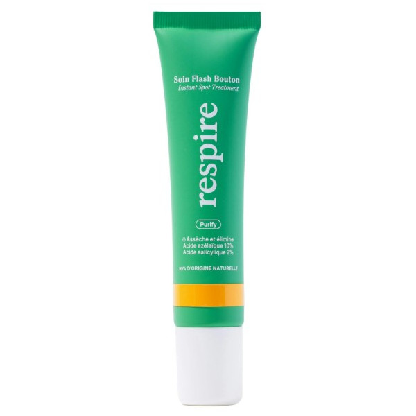 Le Soin Flash Bouton de la marque Respire est destiné aux peaux à tendance acnéique. Formulé à base d'Acide Azélaïque 10 % et d'Acide Salicylique 2 %, ce soin assèche et réduit le(s) bouton(s) en 3 heures top chrono !