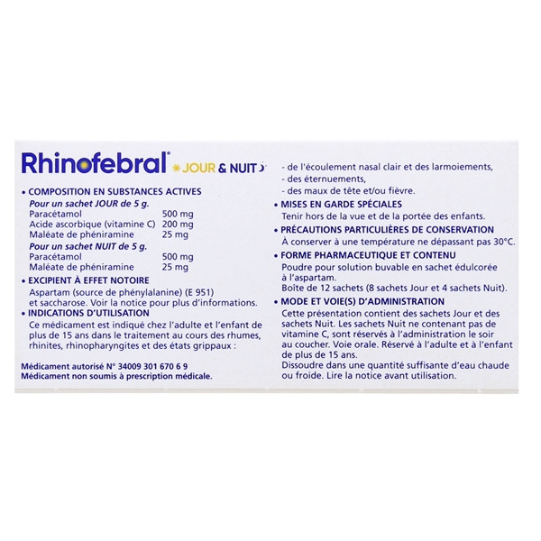 Ce médicament se présente sous forme de sachets Jour et de sachets Nuit : il associe du paracétamol, antipyrétique et antalgique, un antihistaminique ayant un effet asséchant sur les sécrétions nasales, et de la vitamine C. Les sachets Nuit ne contiennent pas de vitamine C