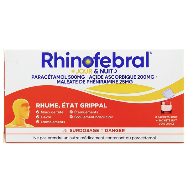 Rhinofebral Rhume Jour et Nuit est un médicament indiqué contre les symptômes du rhume comme le nez bouché, l'écoulement nasal, les maux de tête et la fièvre.