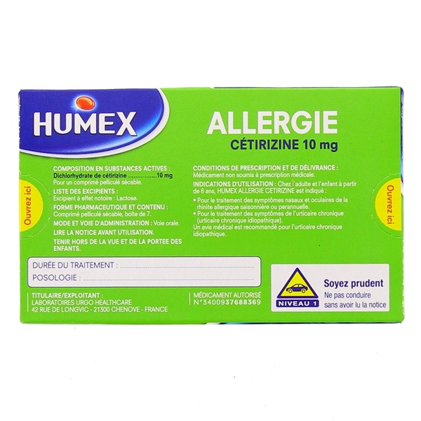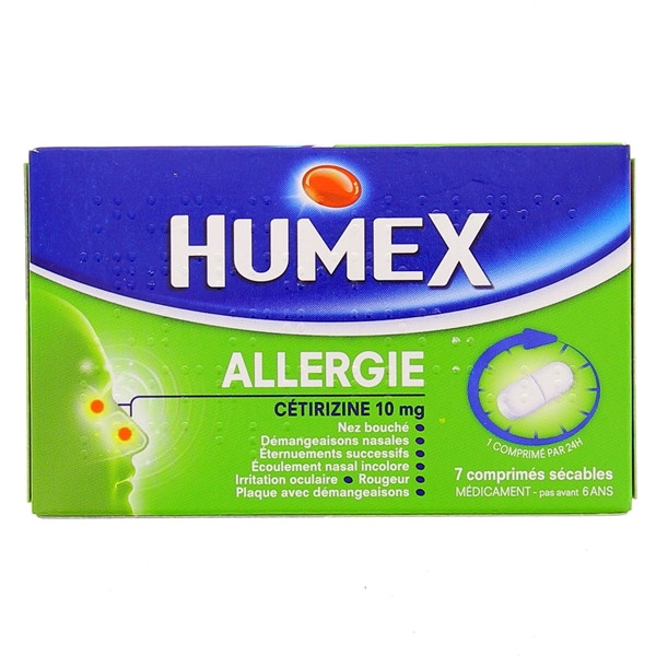 Humex allergie cétirizine s'utilise pour le traitement des symptômes nasaux et oculaires de la rhinite allergique saisonnière ou perannuelle ainsi que pour l'urticaire chronique idiopathique.