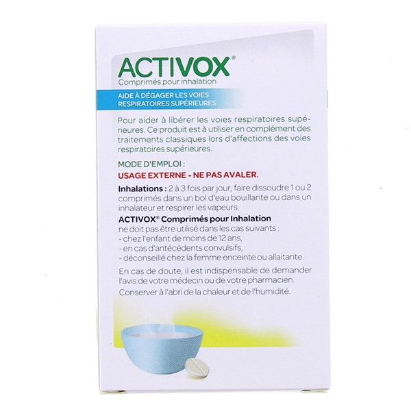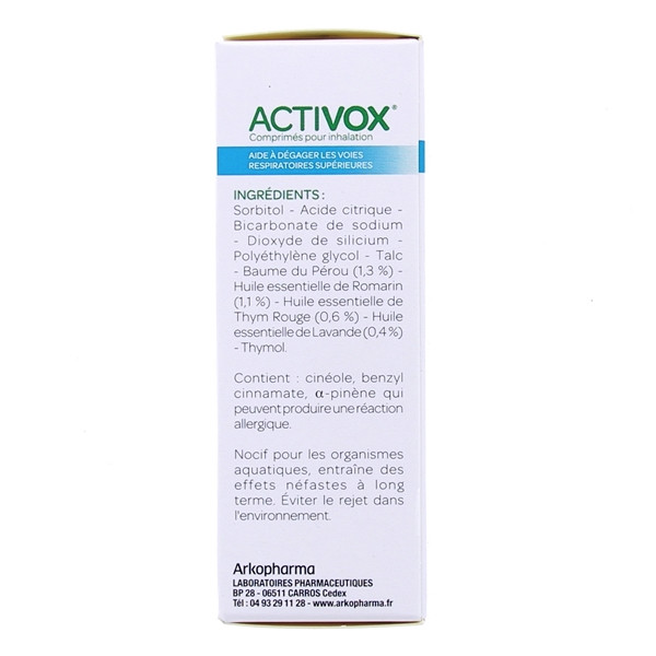 Activox Comprimés pour inhalation est composé d'huiles essentielles. Activox Comprimés pour inhalation aide à libérer les voies respiratoires supérieures.