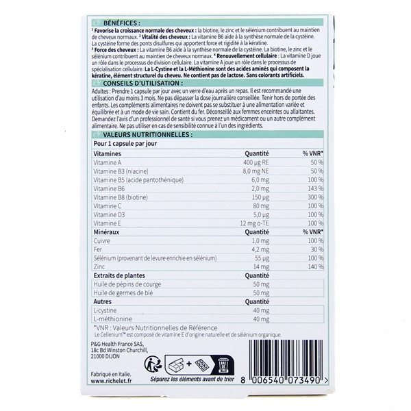 Ce complément alimentaire associe des minéraux et vitamines composants de la kératine. La vitamine B6 contribue à la synthèse de la cystéine. Cette dernière créée des ponts disulfures, procurant rigidité et vigueur à la kératine qui est l’élément structurel du cheveu. Le produit contient aussi de la vitamine D et A, optimisant le renouvellement des cellules. La vitamine D stimule la division cellulaire tandis que la vitamine A soutient le processus de division cellulaire. Le sélénium, le zinc et la biotine, quant à eux, maintiennent les cheveux normaux. Richelet Force des Cheveux ne contient ni colorants artificiels, ni lactose, ni sucre.