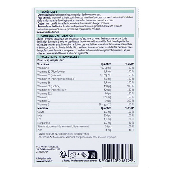 Le complément alimentaire Cheveux Peau Ongles de Richelet favorise le renouvellement cellulaire et contribue à des cheveux sains, des ongles sains et une peau saine.
