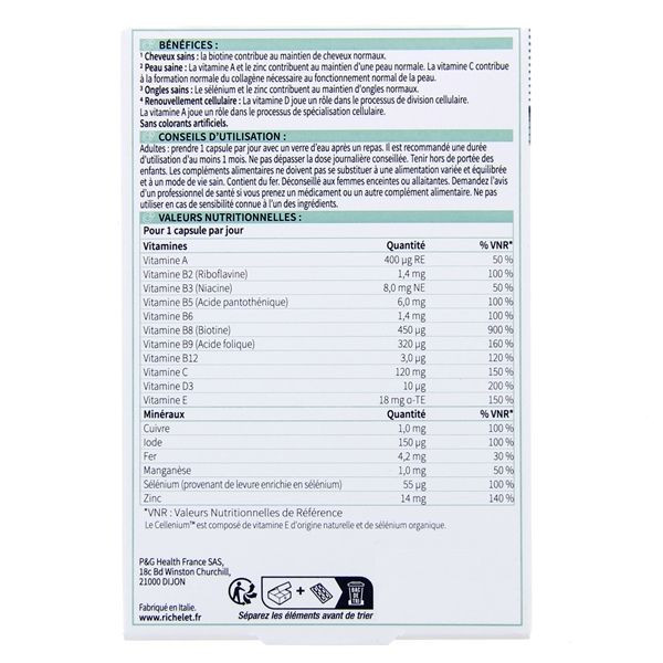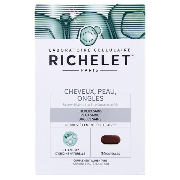 Le complément alimentaire Cheveux Peau Ongles de Richelet apporte tous les nutriments pour une peau, des ongles et des cheveux en bonne santé et sublimés.