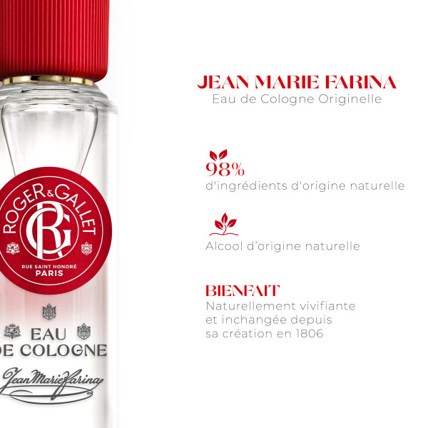 Eau de Cologne Jean-Marie Farina est un soin naturellement vivifiant qui est inchangé depuis sa création en 1806. Promettant une expérience sensorielle unique, il vous transporte dans un univers de bien-être et de sérénité. Produite à Grasse, il affiche dès sa composition un taux de naturalité de 98 %.