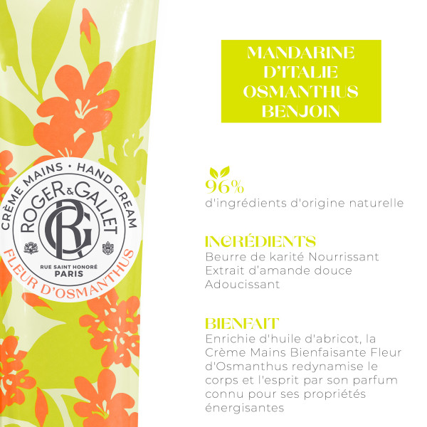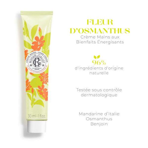 Roger & Gallet propose une crème pour les mains adaptée aux besoins des peaux sèches ou fragilisées : la Crème Bienfaisante Fleur d’Osmanthus. Ce soin quotidien hydrate l’épiderme et aide à restaurer le film hydrolipidique tout en assurant un confort immédiat sans effet gras.