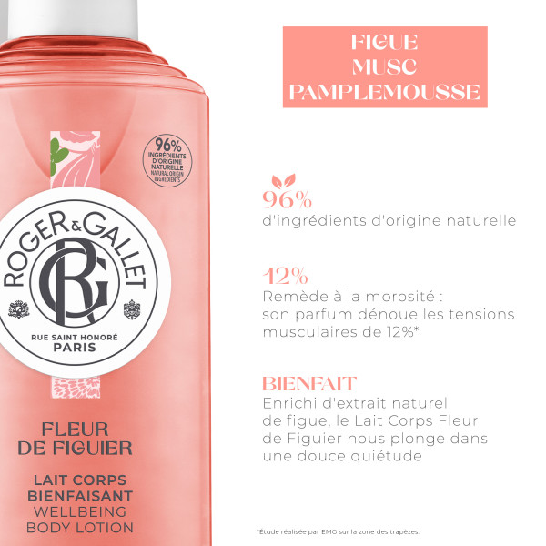 Le Lait Corps Bienfaisant Fleur de Figuier de Roger & Gallet est enrichi en extrait de figue aux vertus relaxantes et en beurre de karité pour nourrir et hydrater la peau pendant 24 h. Sa texture fluide pénètre instantanément et laisse un délicieux parfum sur la peau.
