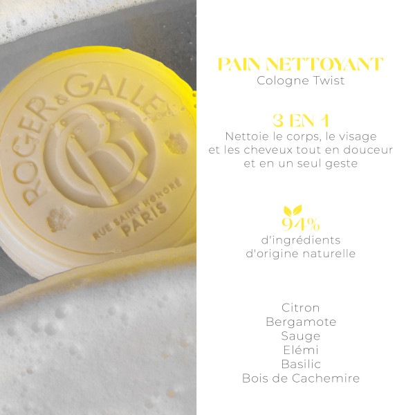 Le Pain Nettoyant 3en1 Cologne Twist Homme de Roger & Gallet nettoie le corps, le visage et les cheveux en douceur, tout en laissant un parfum frais et boisé. Format solide sans plastique, texture crémeuse, idéal pour un rituel masculin complet et pratique.