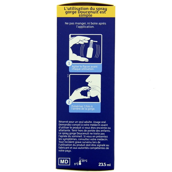 Le Spray buccal Doucenuit élimine efficacement les vibrations au niveau de la gorge. Avec son goût naturel de menthe, il procure une sensation de confort à la gorge et agit durablement pendant la nuit. Il est très pratique et simple à utiliser.
