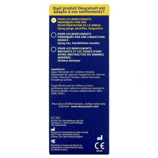 Le Spray buccal Doucenuit de la marque PHARM'UP est la solution indiquée contre le ronflement. Les actifs naturels contenus dans ce spray lubrifient les tissus mous de la gorge tout en les tonifiant.