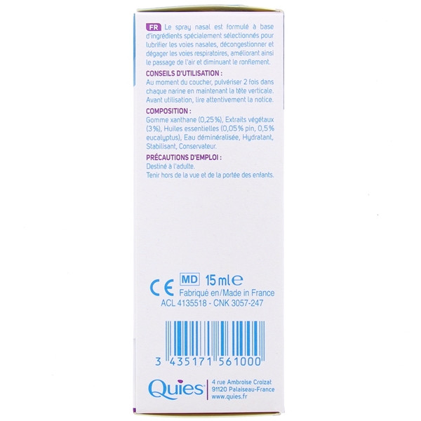 Le Spray Nasal anti ronflement aux huiles essentielles de pin et d’eucalyptus de Quies favorise la respiration par le nez. Ses extraits d’hamamélis, de petit houx et de marron d’Inde dégagent les voies respiratoires, tandis que son agent filmogène naturel lubrifie les parois nasales. Efficace immédiatement, il procure une sensation de plus ample respiration. Le passage de l’air est facilité et le ronflement fortement diminué.