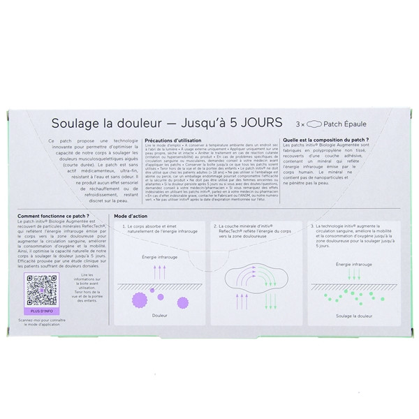 Ce patch Initiv® Biologie Augmentée pour épaule propose une technologie innovante, la technologie ReflecTech®, pour permettre d'optimiser la capacité naturelle de notre corps à soulager les douleurs musco-squelettiques (touchant les articulations, les muscles et les tendons) aiguës (courte durée) de l'épaule. Des particules minérales ReflecTech® recouvre le patch Initiv® pour refléter l'énergie infrarouge émise par le corps vers la zone douloureuse afin d'augmenter la circulation sanguine, d'améliorer la consommation d'oxygène et la mobilité.