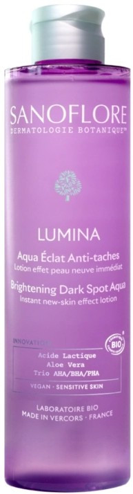 Aqua Éclat Anti-Taches Bio de la gamme Lumina du laboratoire botanique Sanoflore est une lotion tonique effet peau neuve immédiat qui corrige tous types de taches : acné, âge, soleil et grossesse.