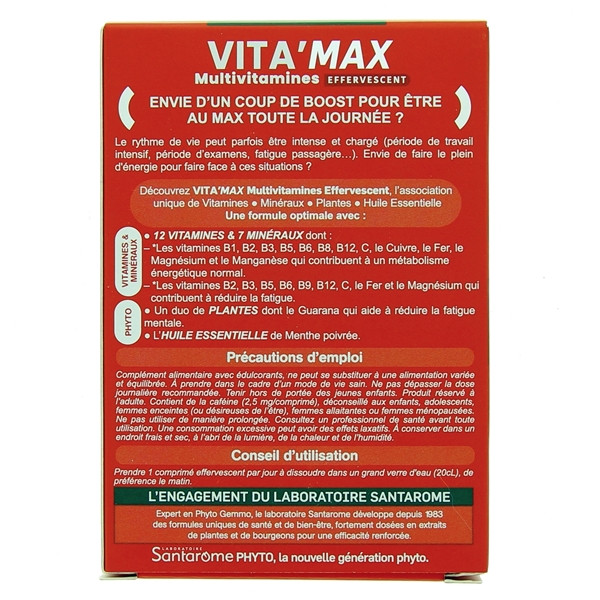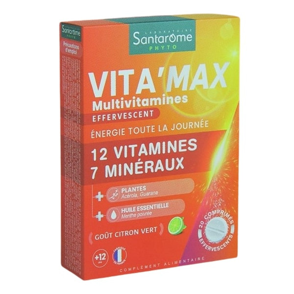 Vita'max Multivitamines Effervescent du laboratoire Santarome est un complément alimentaire à base de 12 vitamines, 7 minéraux, de plantes, d'huile essentielle pour contribuer à réduire la fatigue.