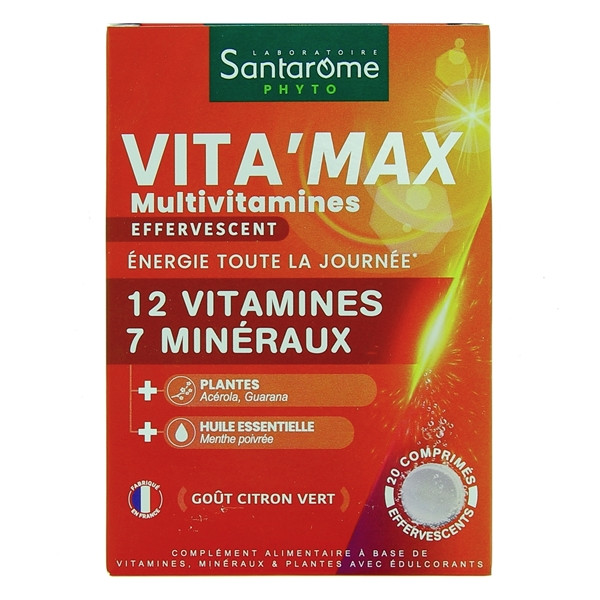 Par ailleurs, Vita'Max Multivitamines Effervescent x20cpr Santarome a été fabriqué par la marque Santarome, une entreprise française spécialisée dans les compléments alimentaires à base de plantes et de nutriments essentiels.