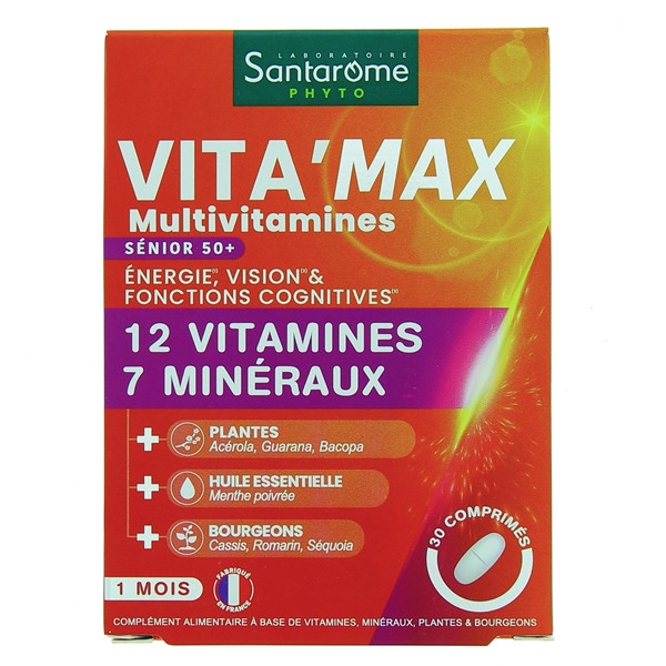 Vita'max Multivitamines Senior 50+ du laboratoire Santarome est un complément alimentaire à base de 12 vitamines, de 7 minéraux, de plantes, d'huile essentielle et de bourgeons pour favoriser l'énergie, maintenir une vision normale et contribuer à une fonction cognitive normale.