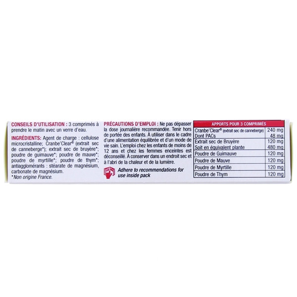 Agent de charge : cellulose microcristalline ; Cranbe'Clear® (extrait sec de canneberge*) ; extrait sec de bruyère* ; poudre de guimauve* ; poudre de mauve* ; poudre de myrtille* ; poudre de thym* ; antiagglomérants : stéarate de magnésium, carbonate de magnésium.