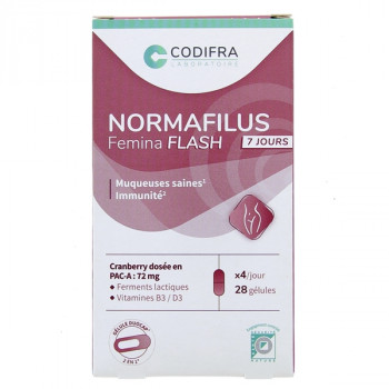 Normafilus Femina Flash du laboratoire Codifra est un complément alimentaire à base de cranberry, de ferments lactiques et de vitamines pour contribuer au maintien de muqueuses saines et au fonctionnement normal du système immunitaire.