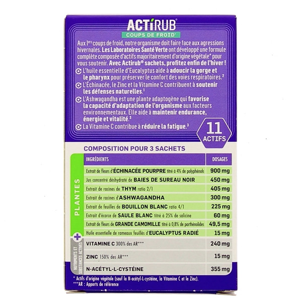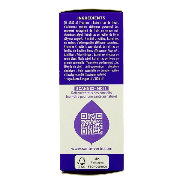 Fructose, Extrait sec de fleurs d'Échinacée pourpre (Echinacea purpurea), Jus concentré déshydraté de fruits de sureau noir (Sambucus nigra), Extrait sec de feuilles de thym (Thymus vulgaris), N-acétyl-L-cystéine, Extrait sec de racines d'ashwagandha (Withania somnifera), Vitamine C (Acide L-ascorbique), Extrait sec de feuilles de bouillon blanc (Verbascum thaspus), Acidifiant : Acide citrique, Extrait sec d'écorce de saule blanc (Salix alba), Extrait sec de fleurs de grande camomille (Tanacetum parthenium), Zinc (Oxyde de zinc), Anti-agglomérant : Phosphate dicalcique, Huile essentielle de branche feuillée d'eucalyptus radié (Eucalyptus radiata).