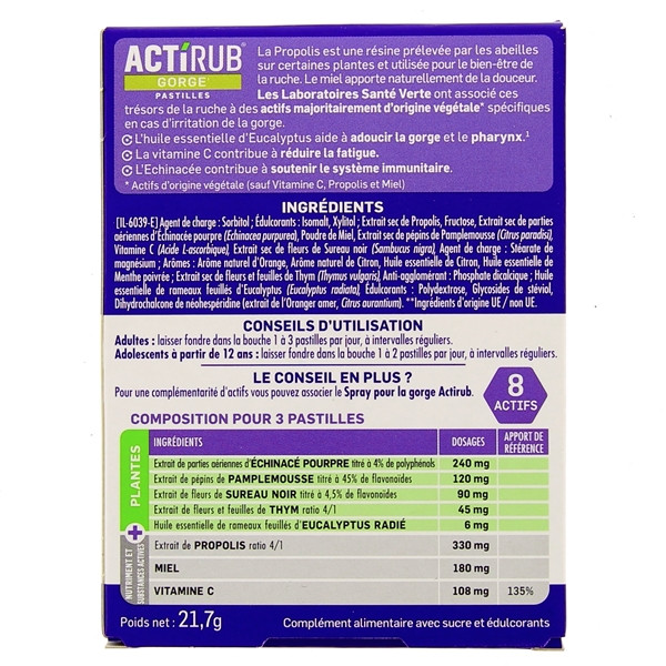 ACTIRUB®* Gorge pastilles possède une formule hautement dosée en propolis avec un complexe de 8 actifs d'origine végétale, avec notamment de :