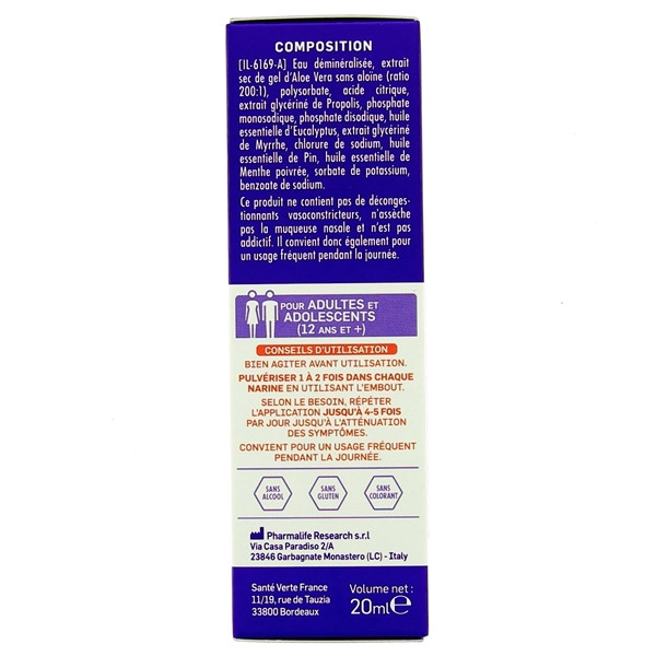 - Rééquilibre les sécrétions nasales et favorise l’hygiène : la solution isotonique favorise le nettoyage de la cavité nasale. De plus, les extraits de Propolis, d’Aloe Vera et de Myrrhe forment un microgel avec une action protectrice sur la muqueuse nasale, prévenant ainsi le contact entre les muqueuses et les agents microbiens et irritants