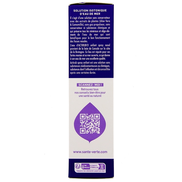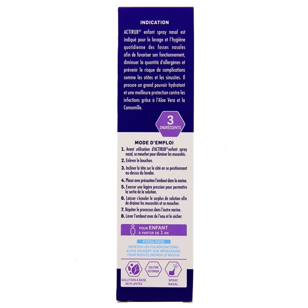 ACTIRUB Enfant Spray Nasal est indiqué pour le lavage et l’hygiène quotidienne des fosses nasales afin de favoriser son fonctionnement, diminuer la quantité d’allergènes et fluidifier. Il procure un pouvoir hydratant et une meilleure protection contre les infections grâce à l’Aloe Vera et la Camomille. Idéal en cas de rhume.