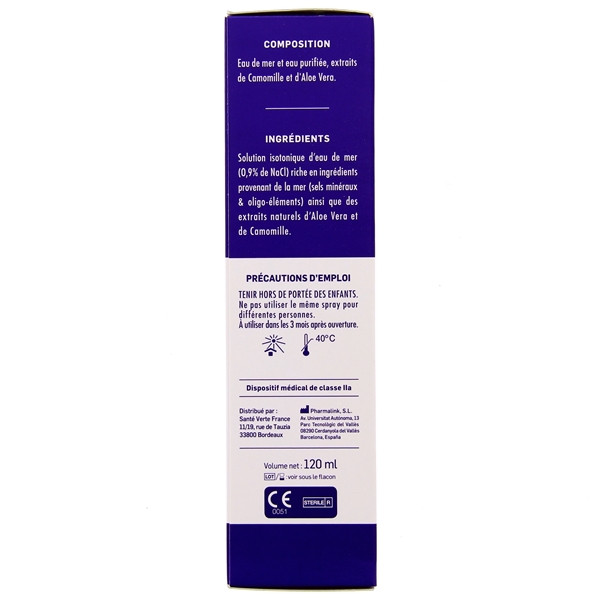 Ce spray nasal est formulé sans conservateur avec des extraits de plantes (Aloe Vera et Camomille), sans gaz propulseur, sans substances chimiques et qui preserve tous les minéraux et oligo-éléments de l'eau de mer (sels minéraux et oligo-éléments) qui sont bénéfiques pour le bon fonctionnement des fosses nasales.
