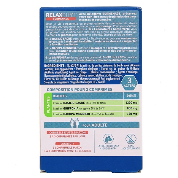 Relaxphyt Surmenage x20cpr sécables Santé Verte renferme un complexe de 3 actifs : basilic sacré, griffonia et bacopa monnieri. Sa formulation a été spécialement pensée afin de conserver la vitalité, résister au stress régulier tout en préservant la concentration et les performances intellectuelles.