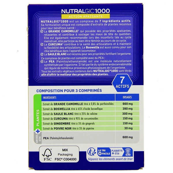 Nutralgic 1000 est un complément alimentaire qui vous apaisera de manière naturelle. Sa formule combine 7 ingrédients soigneusement sélectionnés pour les vertus qu’ils possèdent.