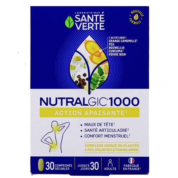 Nutralgic 1000 Action Apaisante des laboratoires Santé Verte est un complément alimentaire pour adultes formulé à base de 6 extraits de plantes et de PEA. Il est indiqué en cas de maux de tête, d'inconfort articulaire ou menstruel.