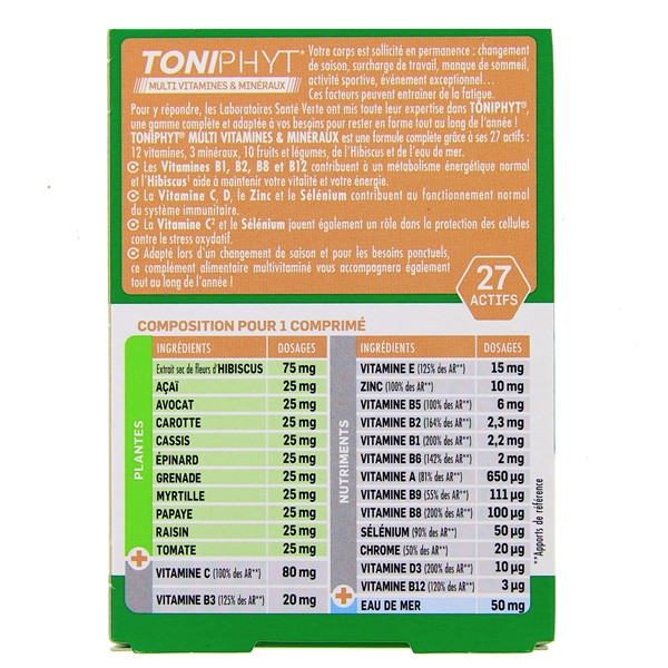 Santé Verte Toniphyt Multi Nature vous redonne instantanément de l’énergie. Il peut être utilisé à n’importe quel moment de l’année. La marque Santé Verte a élaboré ce produit avec diverses vitamines et minéraux pour booster votre vitalité au maximum.