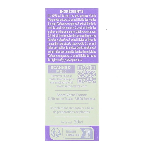 Extrait sec des graines d’Anis (Pimpinella anisum L.), extrait fluide des feuilles d’origan (Origanum vulgare L.), extrait fluide du fruit de carvi (Carum carvi L.), extrait fluide des graines de chardon marie (Silybum marianum G.), Extrait fluide des feuilles de menthe poivrée (Mentha x piperita L.), extrait fluide de fleur de camomille (Matricaria chamomilla L.), Extrait fluide des feuilles de mélisse (Melissa officinalis), extrait fluide des sommités fleuries de marjolaine (Origanum majorana L.), extrait fluide de racine de réglisse (Glycyrrhiza glabra L.).