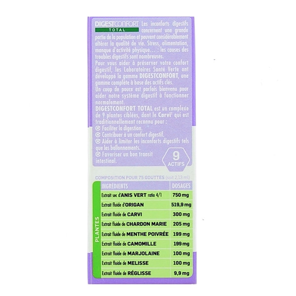 DigestConfort Total des laboratoires Santé Verte est un complexe de 9 plantes ciblées et reconnues pour faciliter la digestion, contribuer à un confort digestif, aider à éliminer les ballonnements et favoriser un bon transit intestinal.