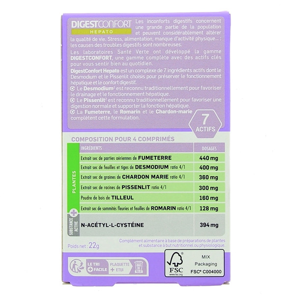 Les comprimés sont également composés de charbon marie, de romarin et d’aubier de tilleul. Le charbon marie est une plante utilisée pour sa capacité à régénérer notamment les cellules du foie. Le romarin favorise la production d’acide biliaire. Et l’aubier de tilleul aide à combattre la rétention d’eau. DigestConfort Hepato x20cpr sécables Santé Verte est un produit fabriqué en France. Il est sans gluten et est spécifiquement adapté aux végétariens.