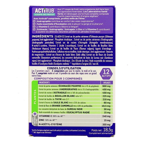 Les comprimés Actirub Coups de froid est indiqué pour faire face aux agressions hivernales. Ce complément alimentaire est réservé à l'adulte.