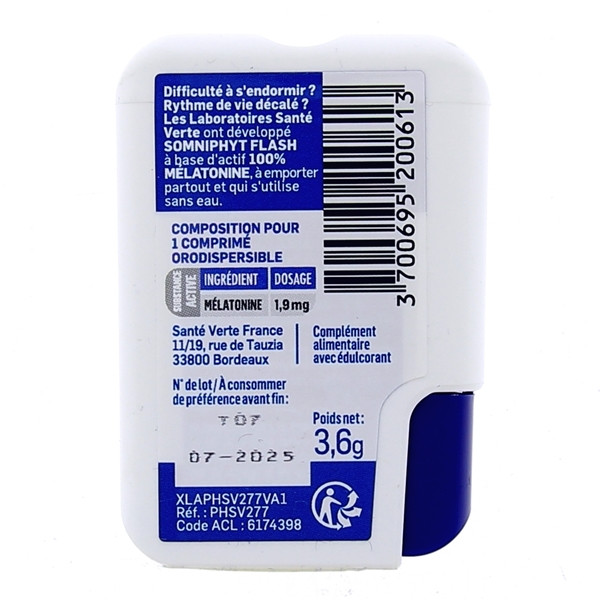 Le complexe SomniPhyt Flash proposé par les laboratoires Santé Verte est formulé avec 1,9 mg de mélatonine et des actifs à base de plante pour aider une personne à trouver le sommeil facilement. Il est aussi indiqué en cas de décalage horaire.
