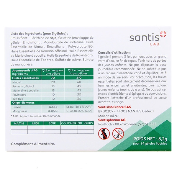 Aromasantis ARG Nez Gorge en boîte de 24 gélules liquides est fabriqué en France par Santis Lab, un laboratoire pharmaceutique et parapharmaceutique spécialisé dans la production de compléments alimentaires de haute qualité.
