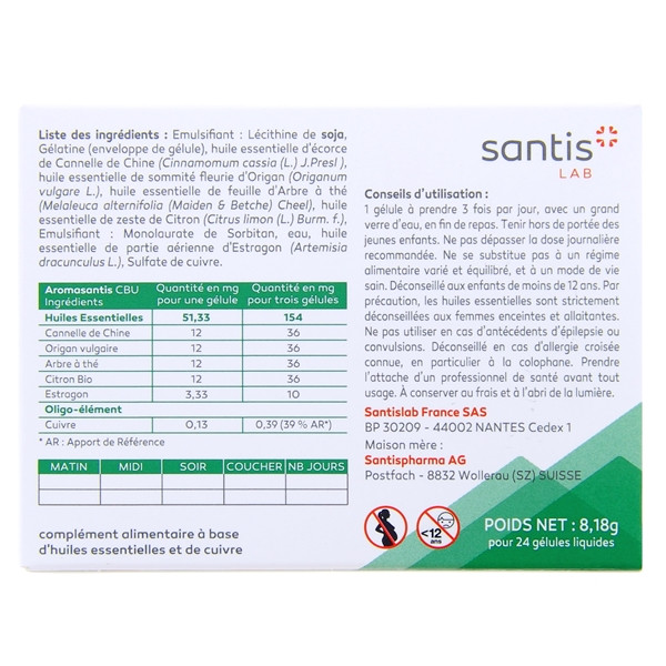 Émulsifiant : Lécithine de soja, Gélatine (enveloppe de gélule), Eau, Huile Essentielle de Cannelle de Chine, Huile Essentielle d’Origan vulgaire, Huile Essentielle de Tea tree, Huile Essentielle d’Estragon, Huile Essentielle de Citron Bio, Emulsifiant : Monolaurate de Sorbitane, Sulfate de Cuivre.