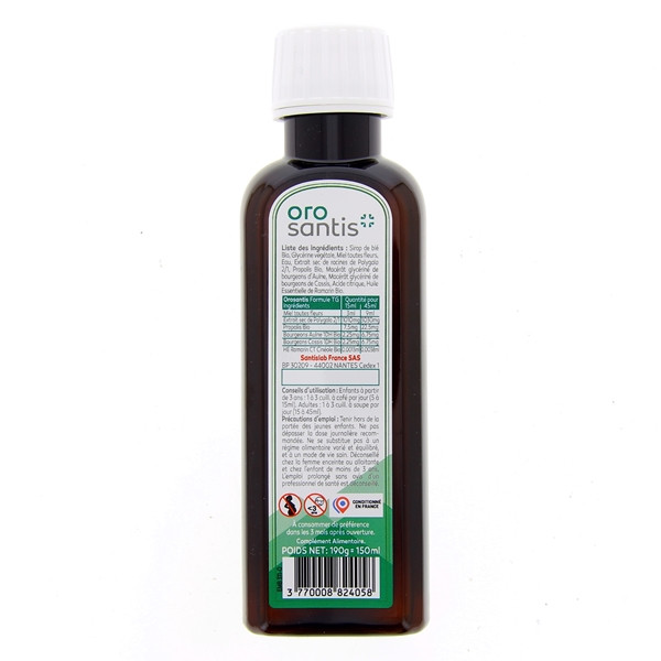 Orosantis TG Sirop de Santis Lab est un complément alimentaire à base de miel, de propolis et d'extraits de plantes. Il est indiqué pour les voies respiratoires encombrées lors d'une toux grasse, d'une bronchite ou d'une sinusite.