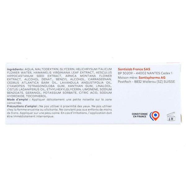 Aqua (water), arnica Montana flowers extract, glycerin, Helichrysum italicum flower water, maltodextrin, Aesculus hippocastanum (horse chestnut) seed extract, alcohol, Hamamelis Virginian (witch hazel) leaf extract, benzyl alcohol, carrageenan, cyamopsis tetragonoloba (guar) gum. Cedrus Atlantica wood oil, Lavandula angustifolia (lavender) oil, xanthan gum, linalool, Cistus ladaniferus oil, ethylhexylglycerin, sodium hydroxide, citric acid, sodium benzoate, limonene, potassium sorbate, geraniol, tocopherol.