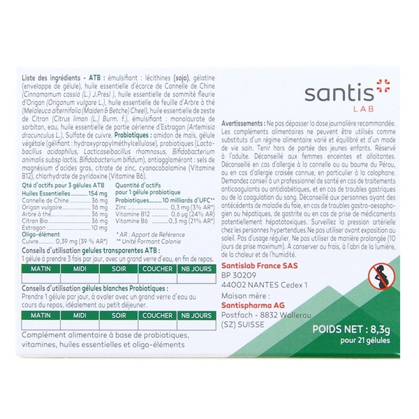 Les gélules Santis Lab Aromasantis Aromafuryl sont formulées à base d’huiles essentielles, d’oligo-élément, de vitamines et de probiotiques. Les gélules liquides associent les bienfaits d’huiles essentielles, dont celle d’estragon aux vertus antispasmodiques qui soulagent rapidement la douleur et celle de citron, aux propriétés hépatoprotectrices et anti-infectieuses. Les extraits concentrés de cannelle, d’origan vulgaire et de tea tree renforcent leurs actions en plus de leurs vertus antibactériennes. Ces capsules contiennent aussi du cuivre, un oligo-élément qui contribue à l'atténuation de l’inflammation provoquée par la prolifération de microbes. Les gélules probiotiques réduisent la quantité de pH dans le côlon, aident le corps à accroître sa production d’acides gras et participent ainsi à l’arrêt la diarrhée. Conditionnement : boîte de 15 gélules liquides ATB + 6 gélules probiotiques.
